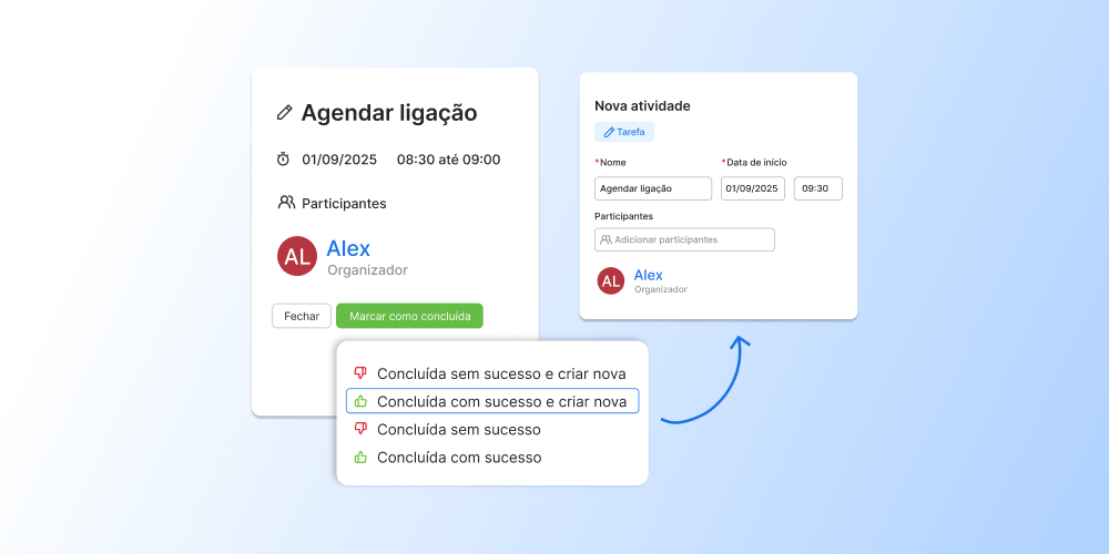 Agora, ao optar por “concluir e criar outra atividade“, o Atendare preserva automaticamente os participantes, atribuições e demais dados já inseridos na tarefa anterior. Dessa forma, não é mais necessário configurar tudo do zero a cada nova atividade, o que otimiza significativamente o processo, especialmente para quem lida com múltiplas interações consecutivas com o mesmo contato.