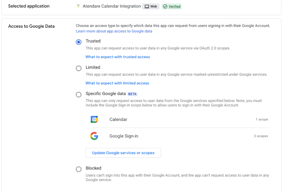 No caso do Atendare, o bloqueio pode ocorrer por ser um aplicativo desconhecido para aquele usuário ou por ser uma integração nova. O Google implementa essas medidas de segurança para garantir que apenas aplicativos confiáveis e verificados possam acessar dados e serviços dentro do Google Workspace. Portanto, é necessário marcar o Atendare como confiável para garantir que ele possa funcionar corretamente.
